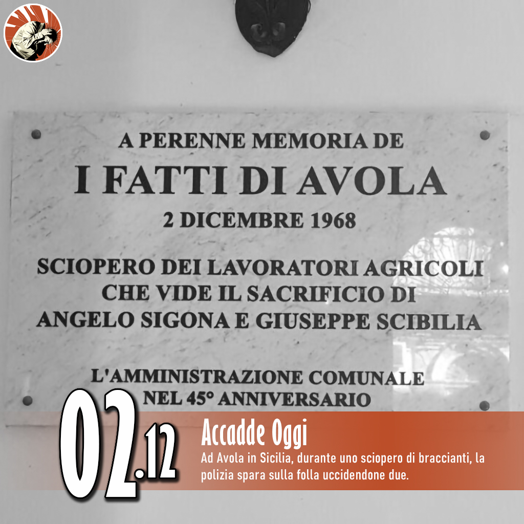 Ad Avola il 2 Dicembre viene proclamato lo sciopero generale. Sono chiusi uffici, banche, negozi, scuole, poste, cantieri, bar e circoli, tutti a sostegno della lotta dei braccianti per il rinnovo del contratto di lavoro.