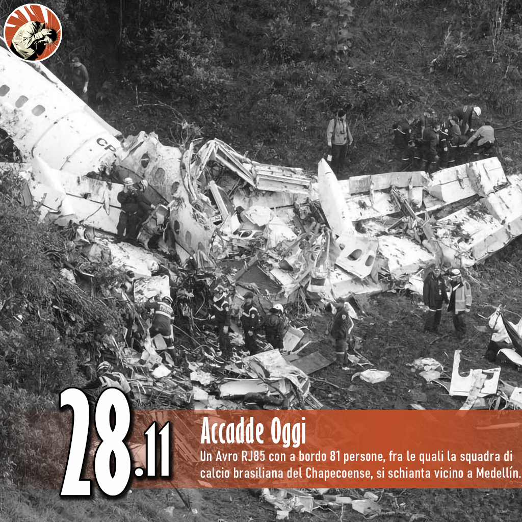 Disastro aereo del volo LaMia 2933: un Avro RJ85, con a bordo 81 persone, fra le quali la squadra di calcio brasiliana del Chapecoense, si schianta vicino a Medellín in Colombia.