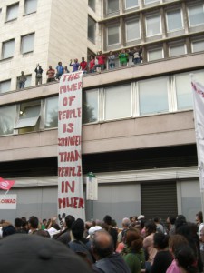 Chi è violento? I manifestanti? Lo Stato? Chi occupa le case per il diritto ad abitare? Le banche che ti portano via la casa perché sei disoccupato? I NoTav? Chi realizza un’opera inutile distruggendo territorio e indebitandoci per le prossime 4 generazioni? Dov’è la violenza? Lo scontro non era contro la polizia. Ma contro il Ministero delle Finanze e dell’Economia. Non c’è differenza? Allora non avete ancora capito nulla.