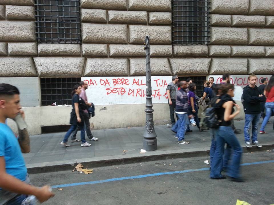 Chi è violento? I manifestanti? Lo Stato? Chi occupa le case per il diritto ad abitare? Le banche che ti portano via la casa perché sei disoccupato? I NoTav? Chi realizza un’opera inutile distruggendo territorio e indebitandoci per le prossime 4 generazioni? Dov’è la violenza? Lo scontro non era contro la polizia. Ma contro il Ministero delle Finanze e dell’Economia. Non c’è differenza? Allora non avete ancora capito nulla.